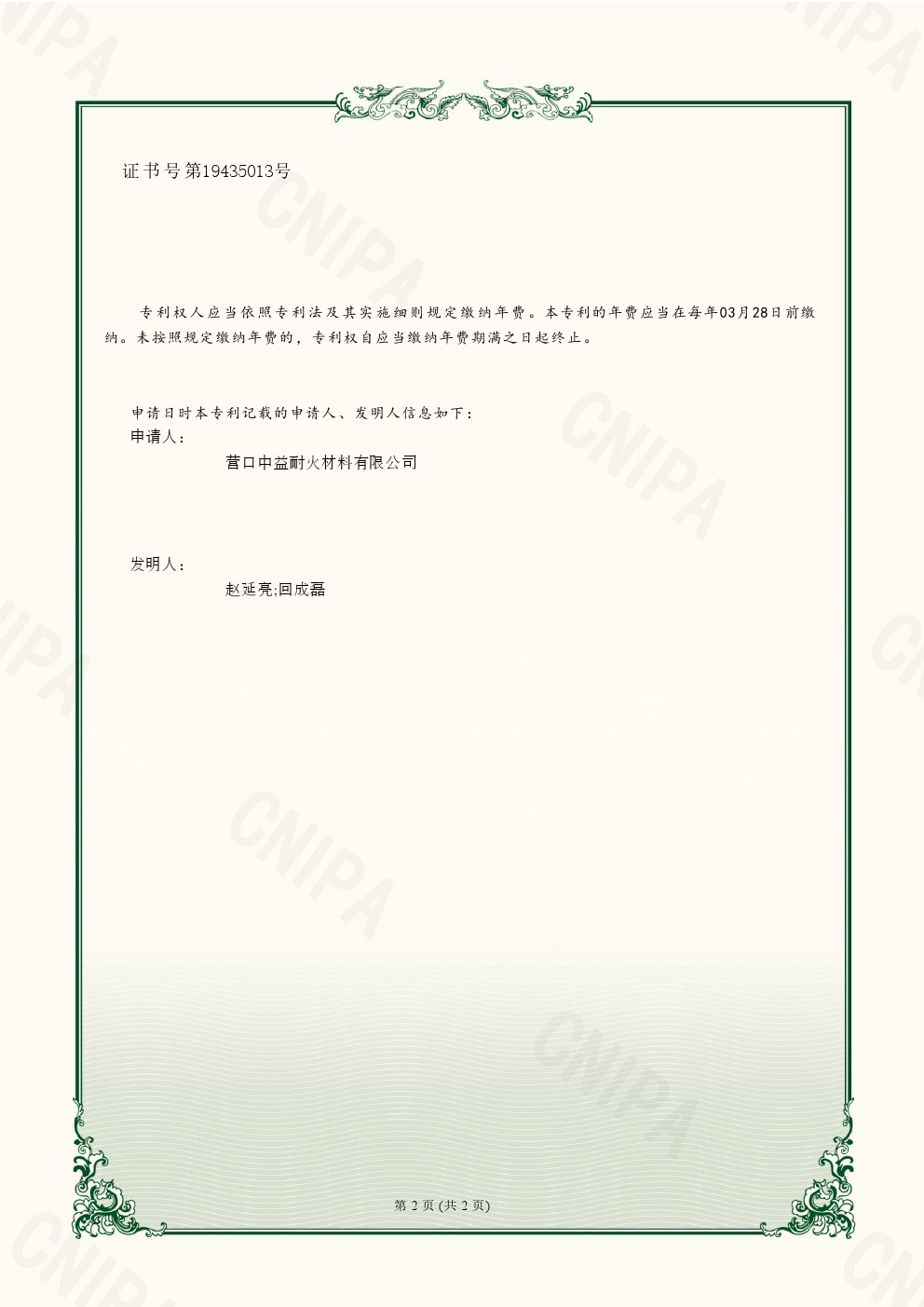 實用新型專利證書一種鎂碳磚加工通風設備