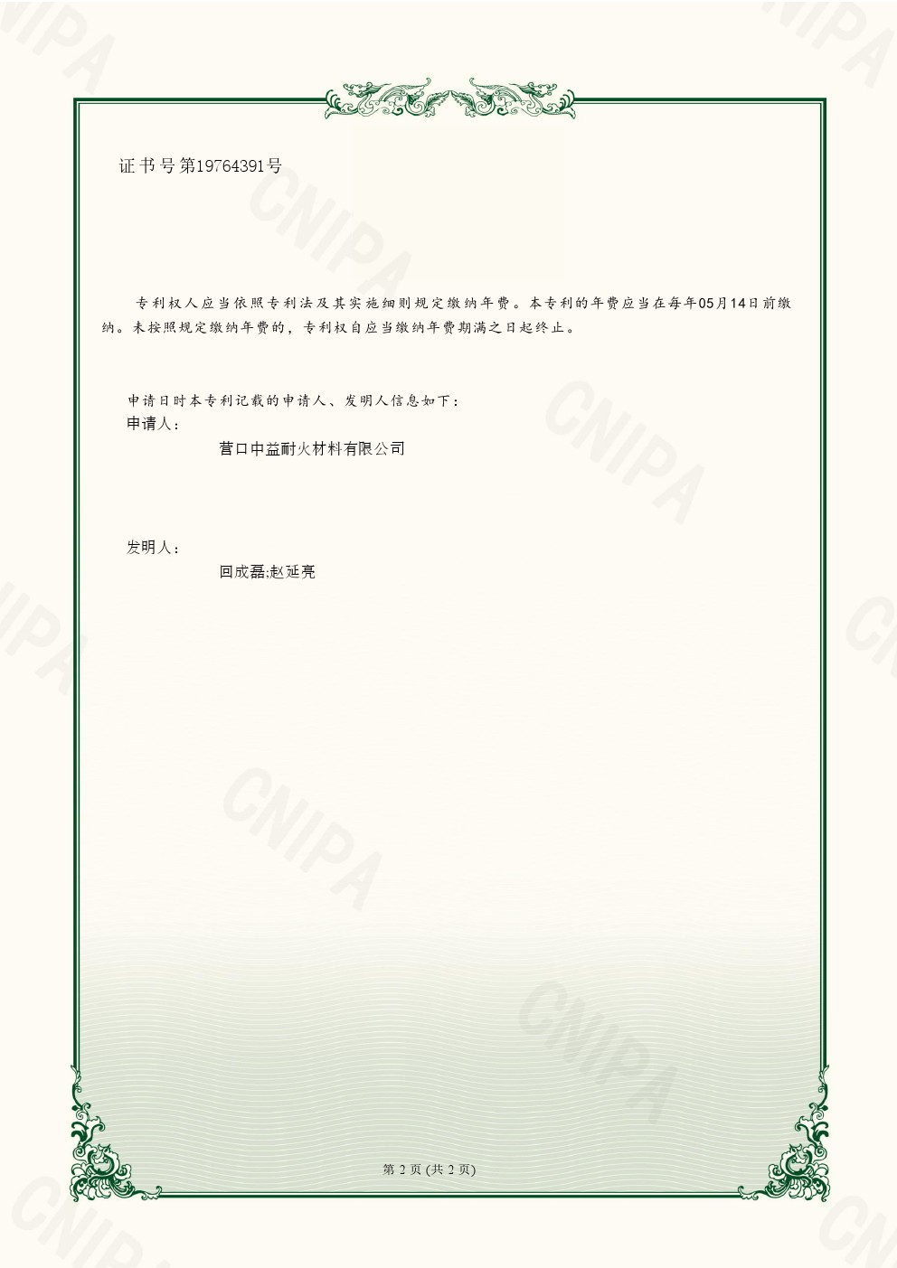 實用新型專利證書一種用于耐火磚的烘干裝置